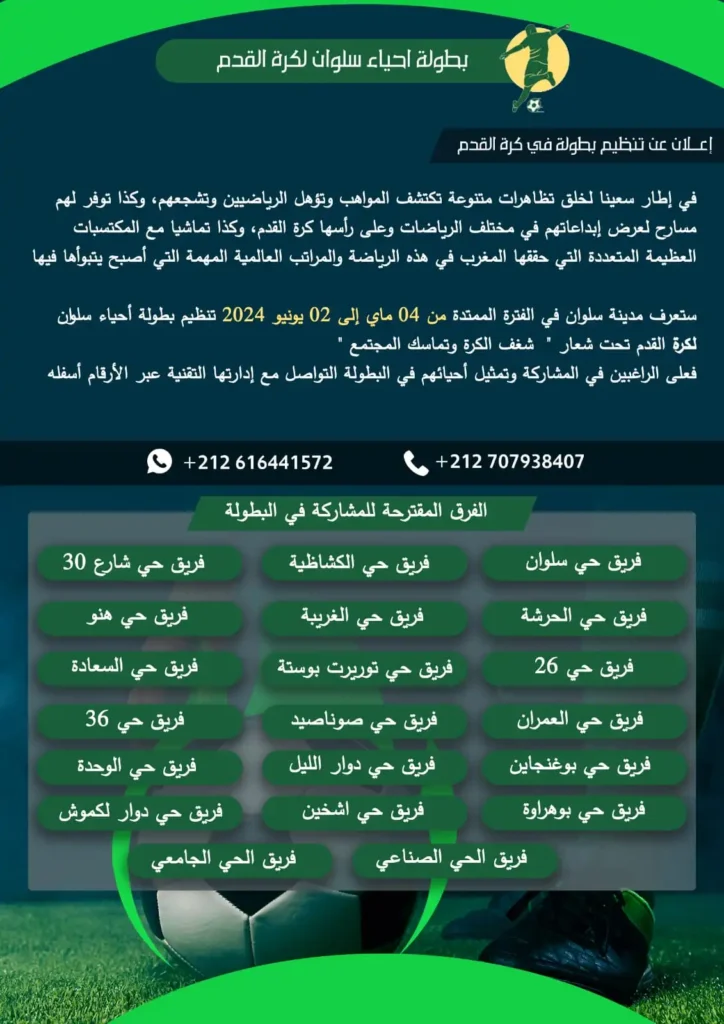 ينظم فرع المنظمة المغربية للطفولة والشباب والتنمية المستدامة بالناظور في الفترة الممتدة من 04 ماي إلى 02 يونيو 2024 بطولة أحياء سلوان لكرة القدم تحت شعار “بطولة أحياء سلوان، شغف الكرة وتماسك المجتمع”