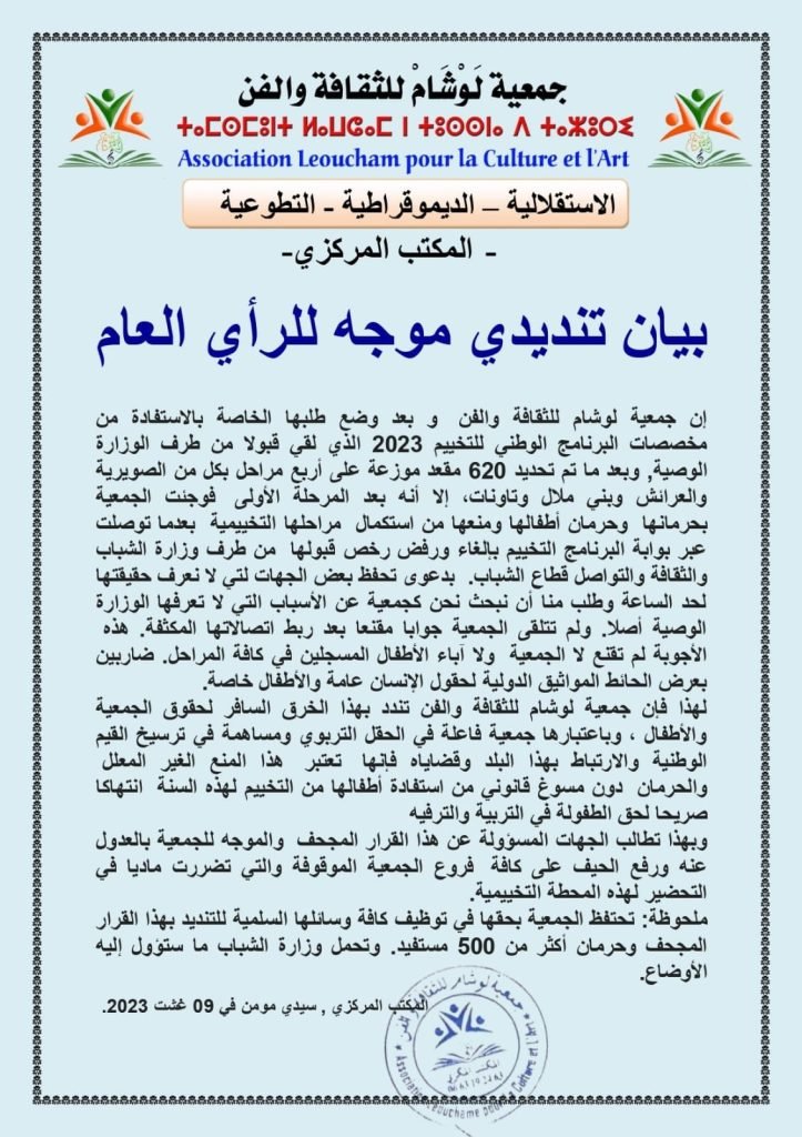 وجهت جمعية لوشلم للثقافة والفن للرأي العام بيان تنديدي بما سمته المنع الغير المبرر الذي حجبت عبره رخص قبولها في البرنامج الوطني للتخييم 2023 وجاء في نص البيان التنديدي ما يلي: إن جمعية لوشام للثقافة والفن و بعد وضع طلبها الخاص بالاستفادة من مخصصات البرنامج الوطني للتخييم 2023 الذي لقي قبولا من طرف الوزارة الوصية,