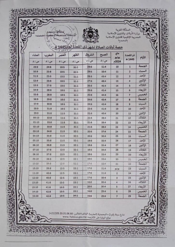 حصة أوقات الصلاة لشهر ذو القعدة 1445 بمدينة المحمدية، الموافق لشهري ماي ويونيو 2024.
