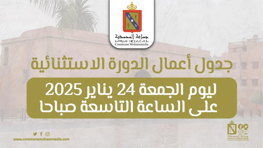 تطبيقا لمقتضيات المادة 37 من القانون التنظيمي 113.14 المتعلق بالجماعات، ستنعقد دورة إستثنائية لمجلس جماعة المحمدية ، صباح يوم الجمعة 24 يناير 2025 على الساعة التاسعة صباحا بقاعة الجلسات بمقر جماعة المحمدية وذلك للتداول في النقطة الفريدة المدرجة في جدول أعمالها: