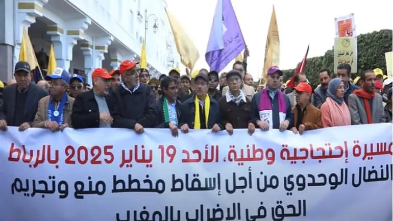 شهدت العاصمة الرباط، أمس الأحد 19 يناير، مسيرة وطنية ضخمة دعت إليها جبهة الدفاع عن الحق في ممارسة الإضراب، بمشاركة واسعة من النقابات والهيئات الحقوقية والمدنية والأحزاب السياسية، وانطلقت المسيرة من ساحة باب الأحد وصولًا إلى شارع محمد الخامس قبالة مقر البرلمان، احتجاجًا على مشروع قانون الإضراب الذي وصفه المشاركون بـ»المقيد للحريات النقابية».