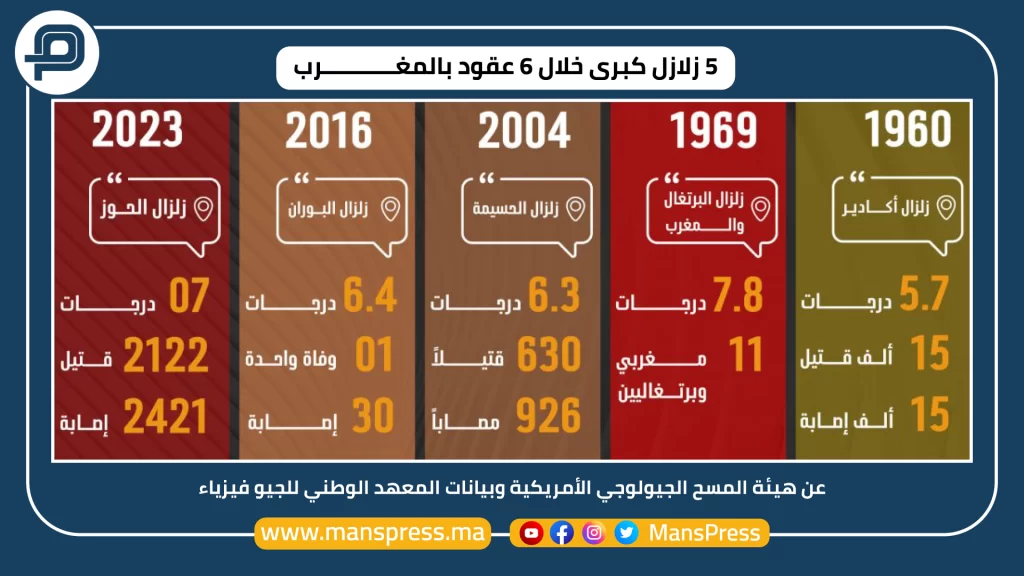 حسب هيئة المسح الجيولوجي الأمريكية وبيانات المعهد الوطني للجيو فيزياء، فإن المغرب شهد منذ الإستقلال 05 زلازل كبرى.