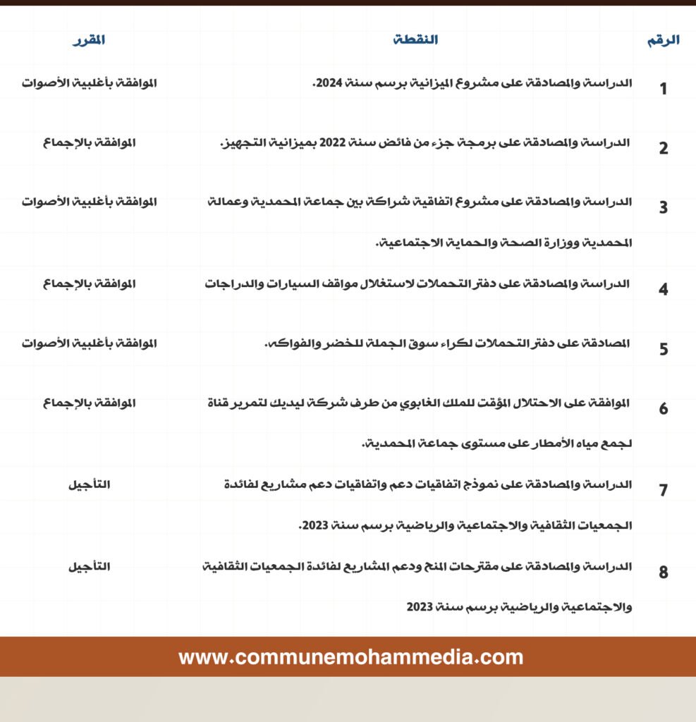 صادق مجلس جماعة المحمدية دورته العادية لشهر أكتوبر 2023 في جلستين يومي الخميس 5 اكتوبر 2023 والجمعة 06 أكتوبر 2023 بالقاعة الكبرى والتي عرفت تداول المجلس في 8 نقط وتمت المصادقة على 6 نقط مع تأجيل نقطتان.