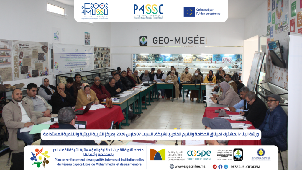 نظمت شبكة الفضاء الحر ورشة البناء المشترك لميثاق الحكامة والقيم الخاص بالشبكة، وذلك يوم السبت 07 مارس 2026 بمركز التربية البيئية والتنمية المستدامة بشارع الجيش الملكي (مقر جمعية مدرسي علوم الحياة والأرض – فرع المحمدية) – المحمدية. وتسعى الشبكة من خلال هذه الورشة إلى التملك الجماعي لأهمية الميثاق وتوضيح دوره ميثاق الحكامة كوثيقة مرجعية تحدد