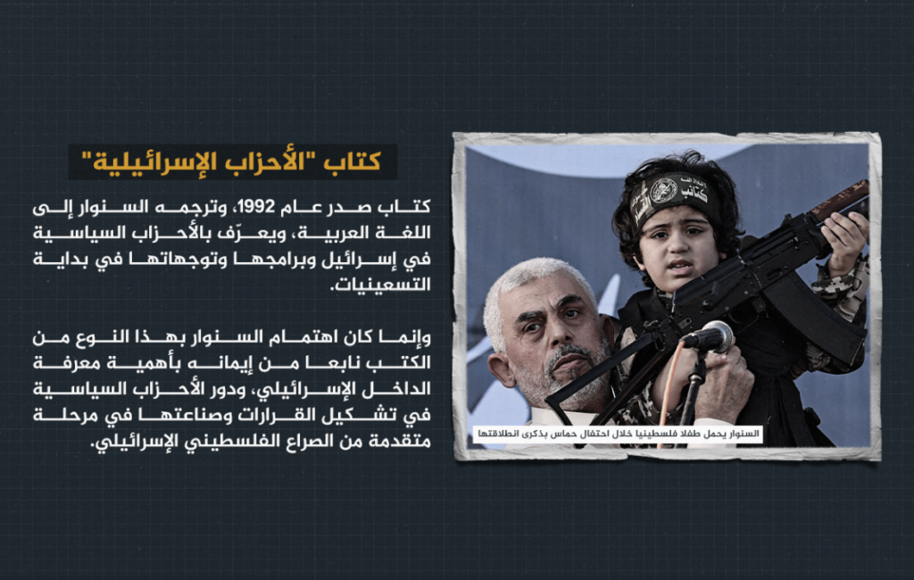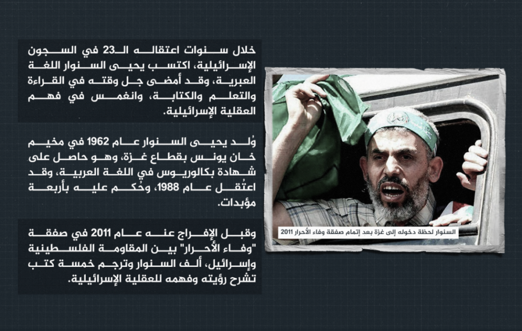 نشر موقع الجزيرة الوثائقية مقالا حول شخصية يحيى السنوار وكيفية تفكيره، ويقول المقال ان الكتب الخمسة التي كتبها هي التي تحدد شخصيته وكيفية تفكيره. اعتقلت قوات الاحتلال الإسرائيلي “يحيى السنوار” -رئيس حركة المقاومة الإسلامية (حماس) في قطاع غزة- عدة مرات، وحكمت عليه بأربعة مؤبدات، قبل أن يفرج عنه في صفقة تبادل أسرى عام 2011، وخلال