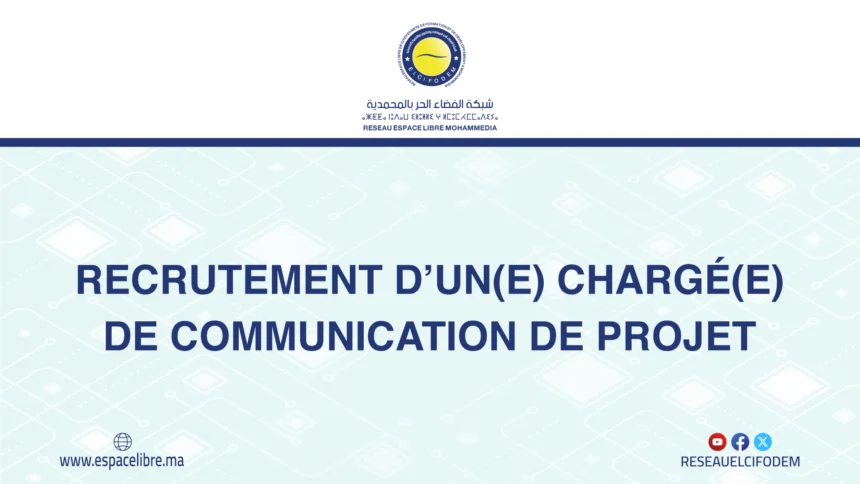le Réseau Espace libre de la citoyenneté, la formation et le développement, à Mohammedia, lance un appel à candidature pour le recrutement d’un(e) Chargé(e) de communication, pour une durée de 13 mois.